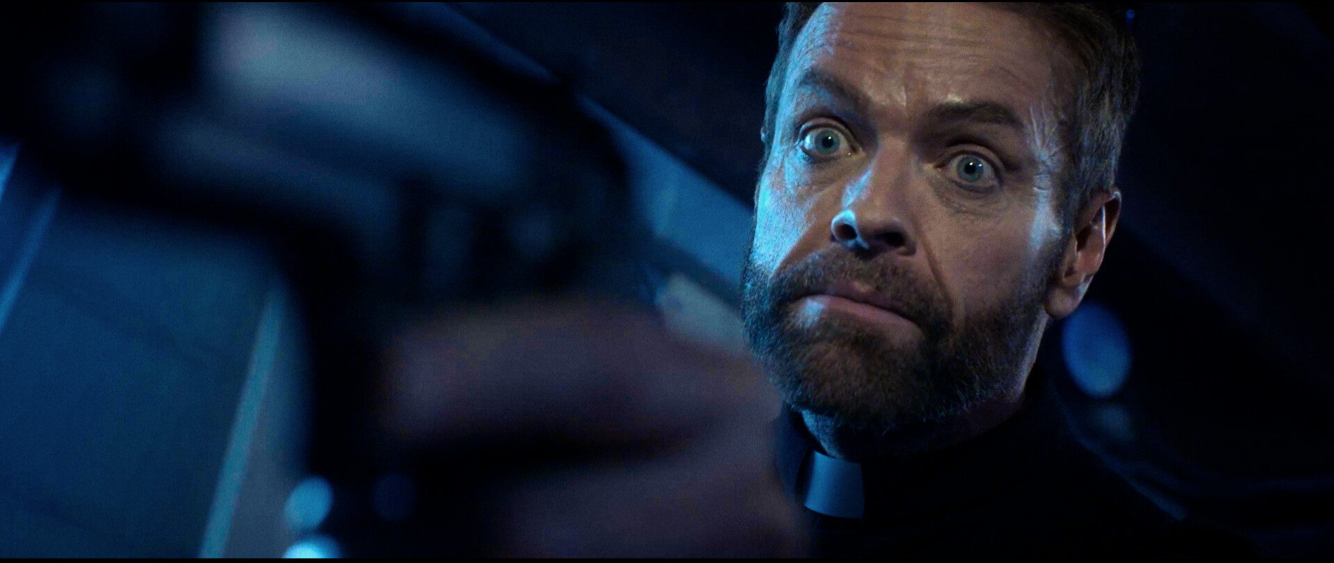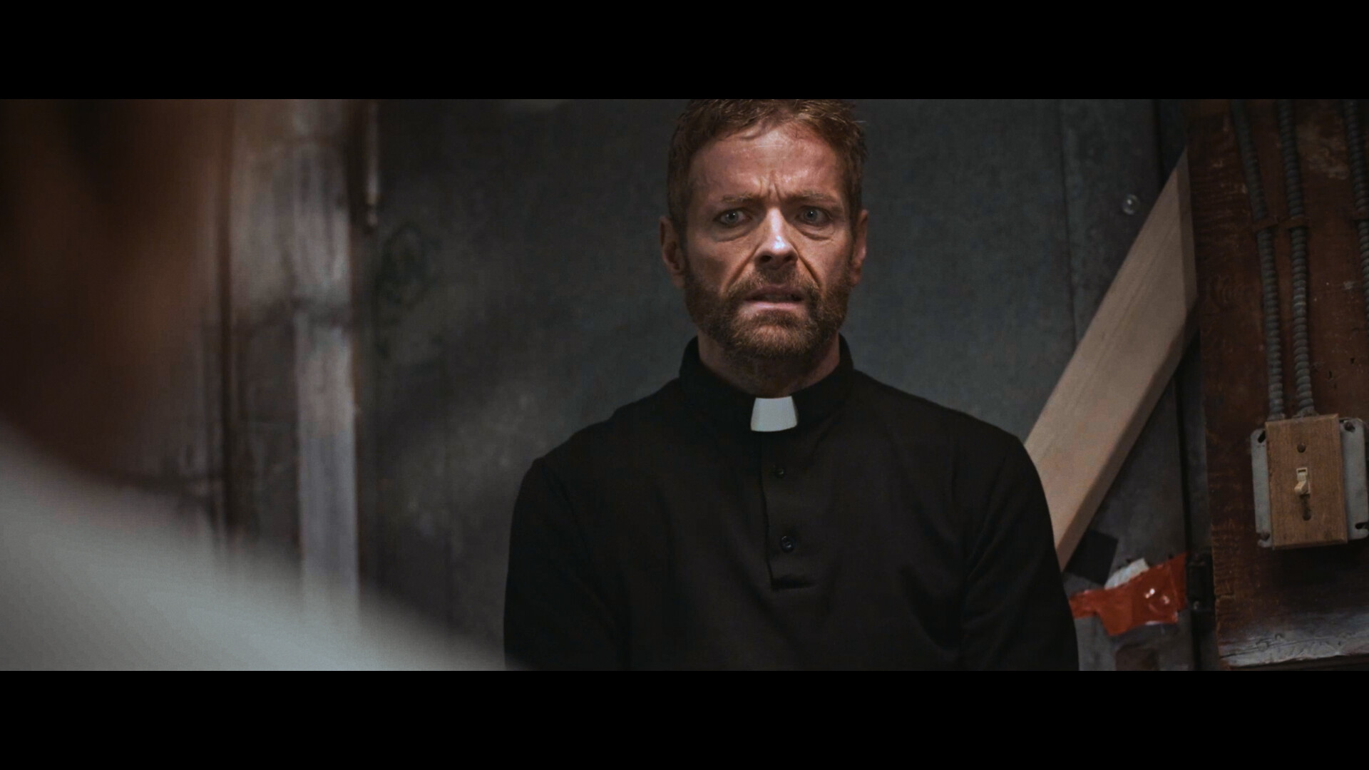 The woman is called Julie (Rachel Marie Powers) and the man is a priest named Chris (Maximillian Mayerhofer). The discussion is extremely tense. Julie defends the leader who has been protecting people from the zombies, while Chris argues that this fellow is a dangerous deceiver. Instead, the priest says that the zombies are also children of God, and thus they have the right to live. This is a creative alternative to the subgenre of zombie movies, as it opens the perspective that these undead creatures may be the new form of life on our planet, substituting today’s humans. The confrontation between Julie and Chris goes beyond the words and falls into real death menace.
